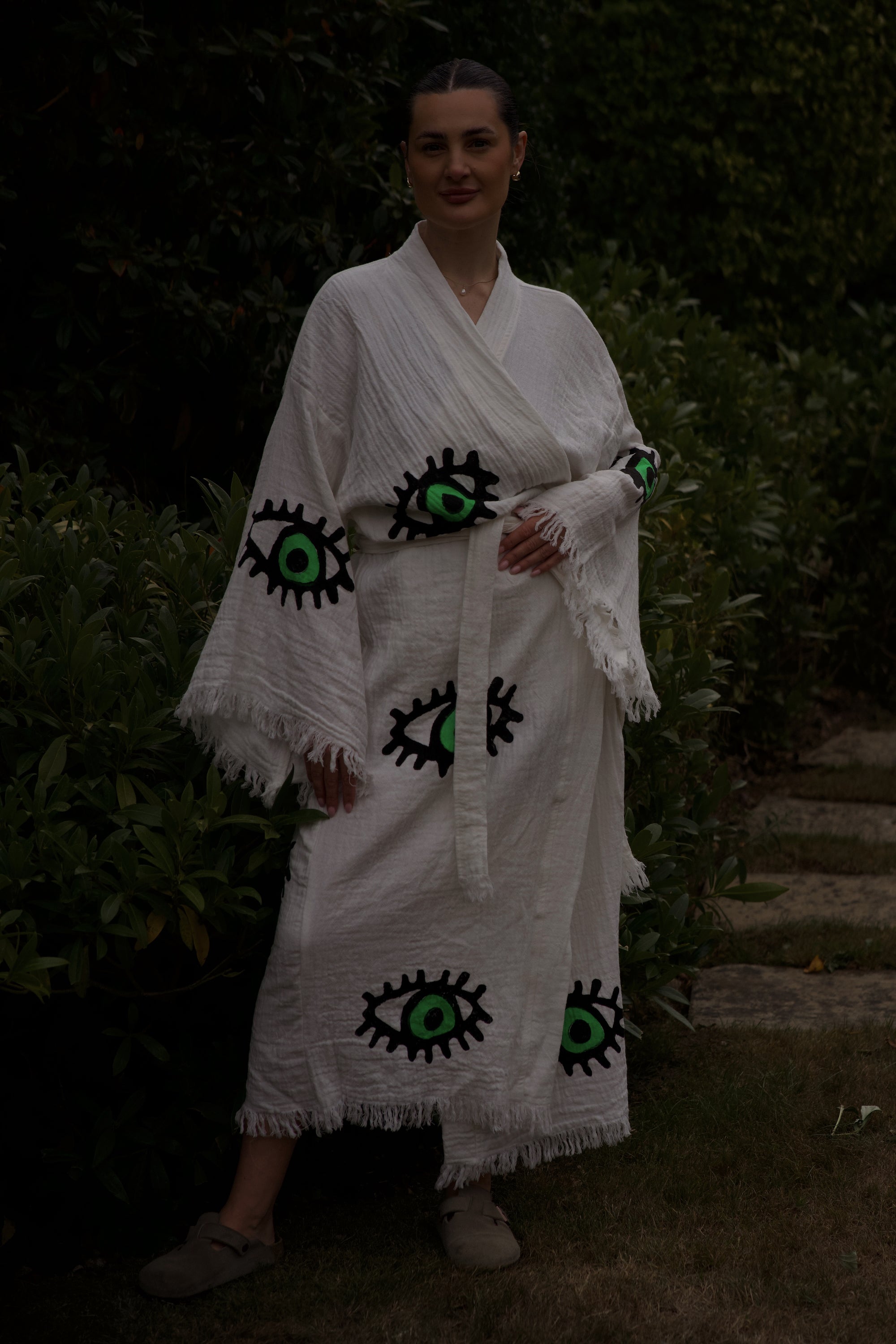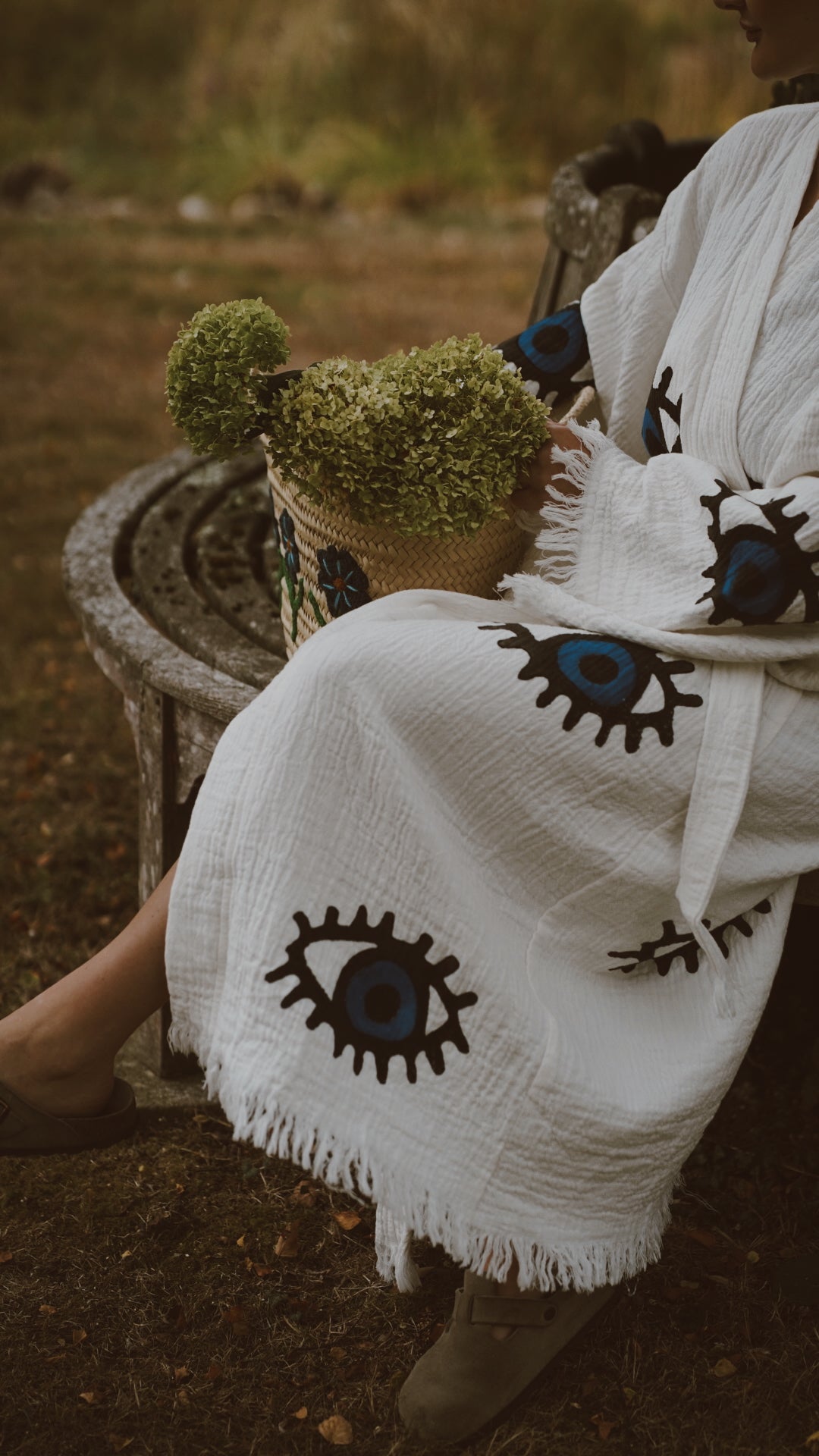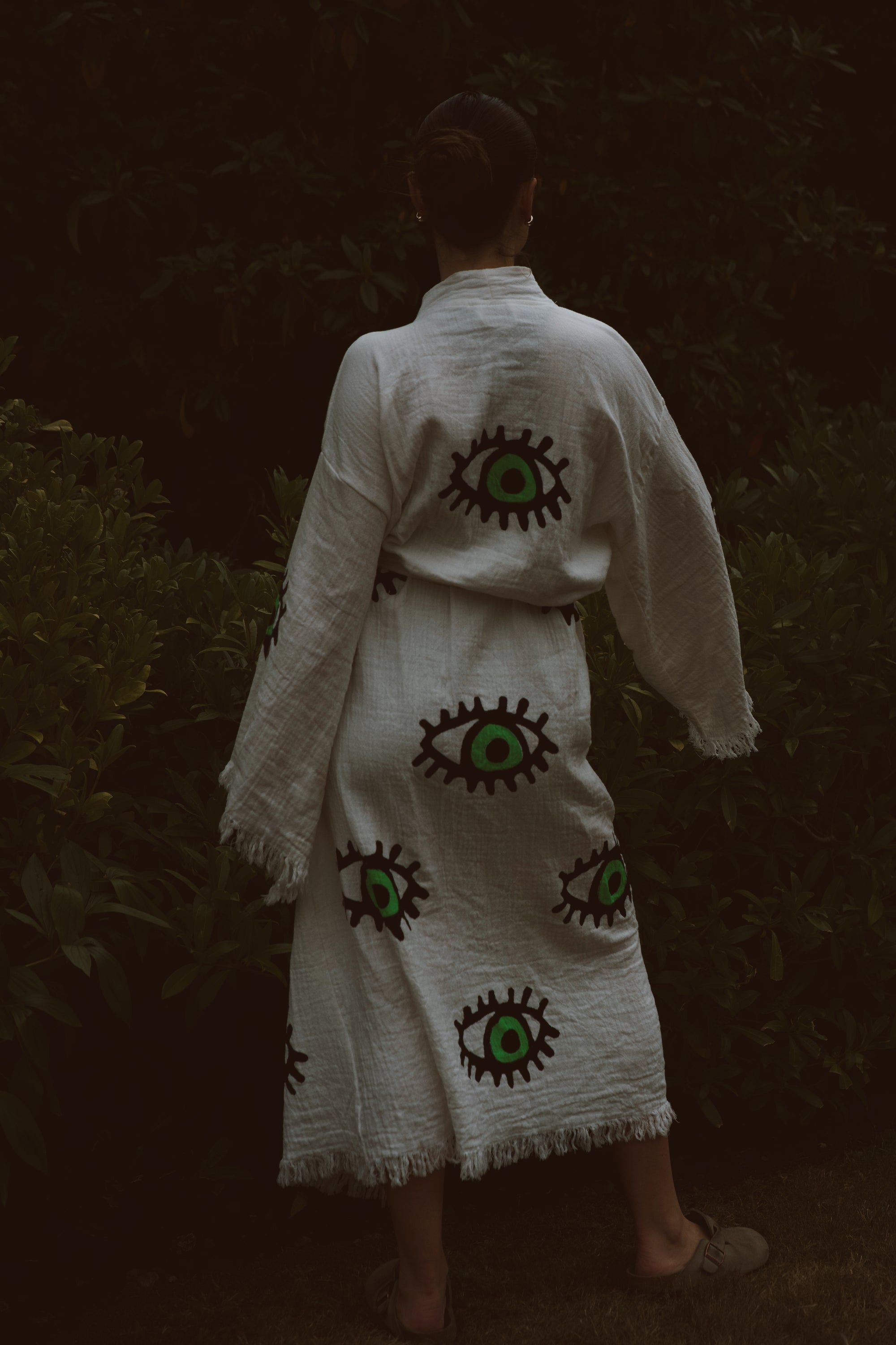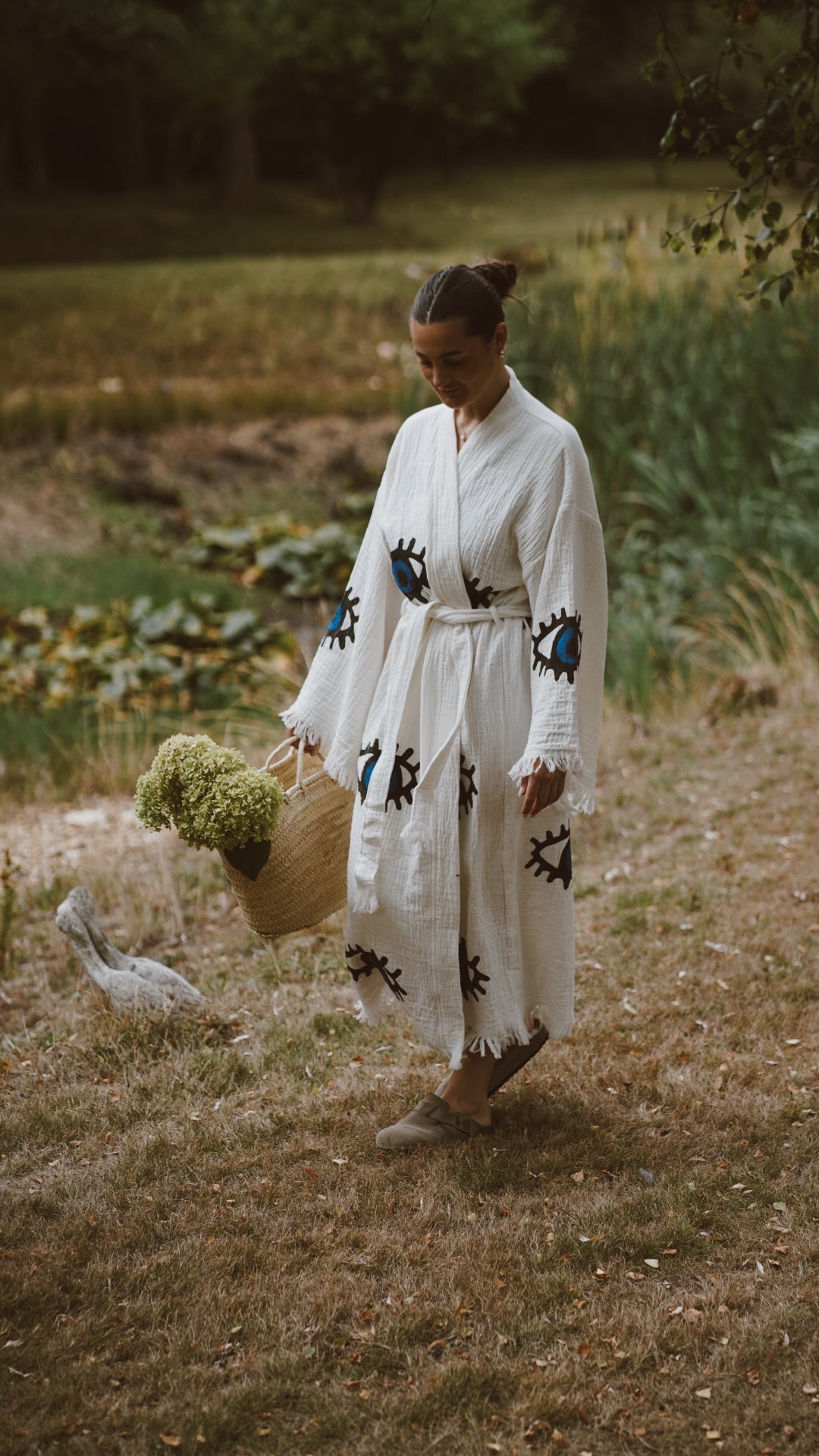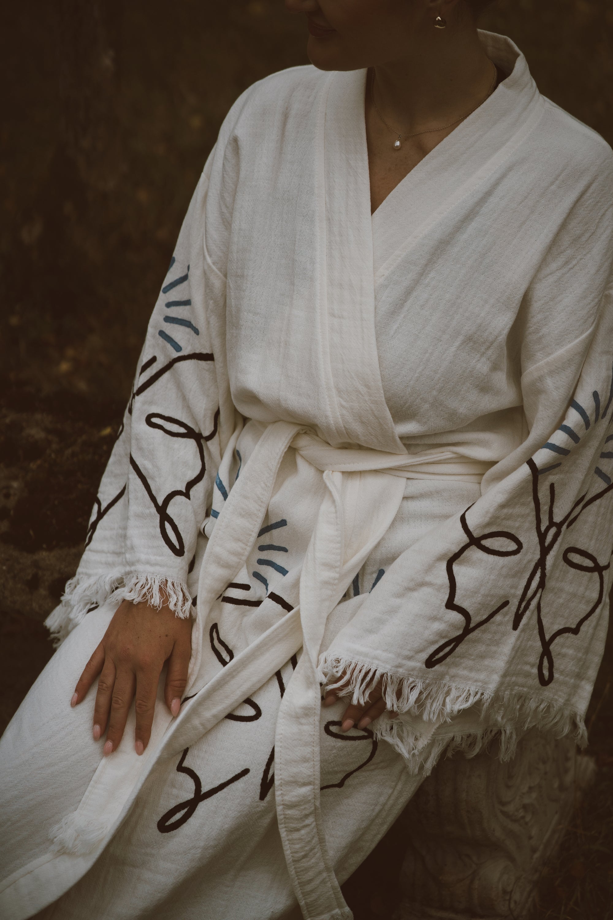 Our kimono robes are beautiful, soft, absorbent, and eco-friendly. Crafted from 100% organic cotton, free from harmful chemicals, and hand-painted with wooden blocks in Turkey, each robe is a true work of art.